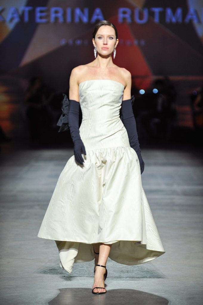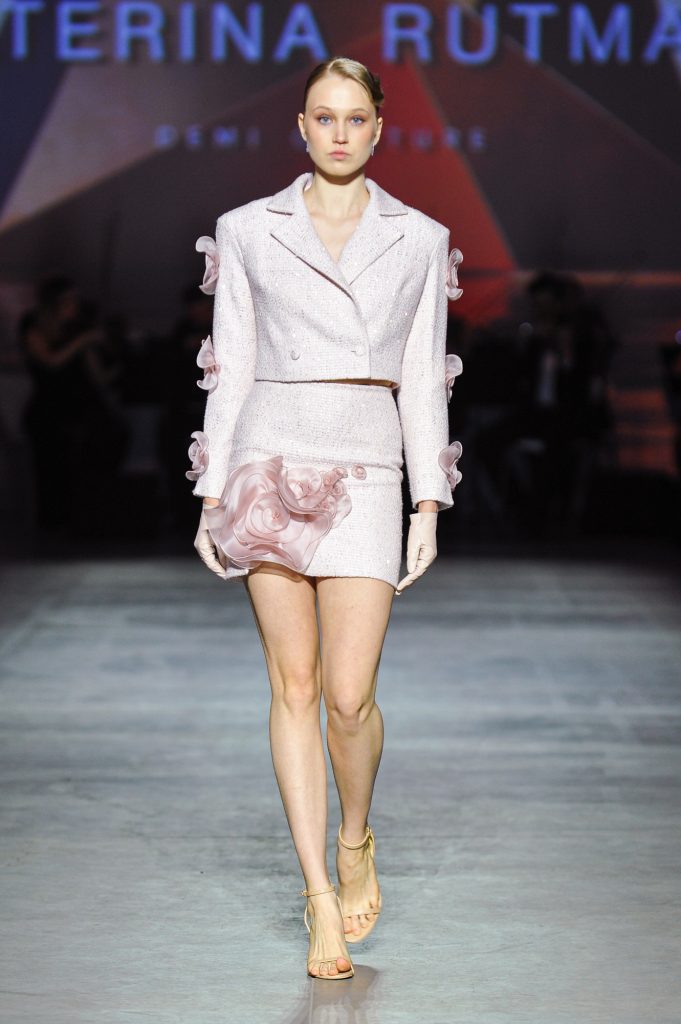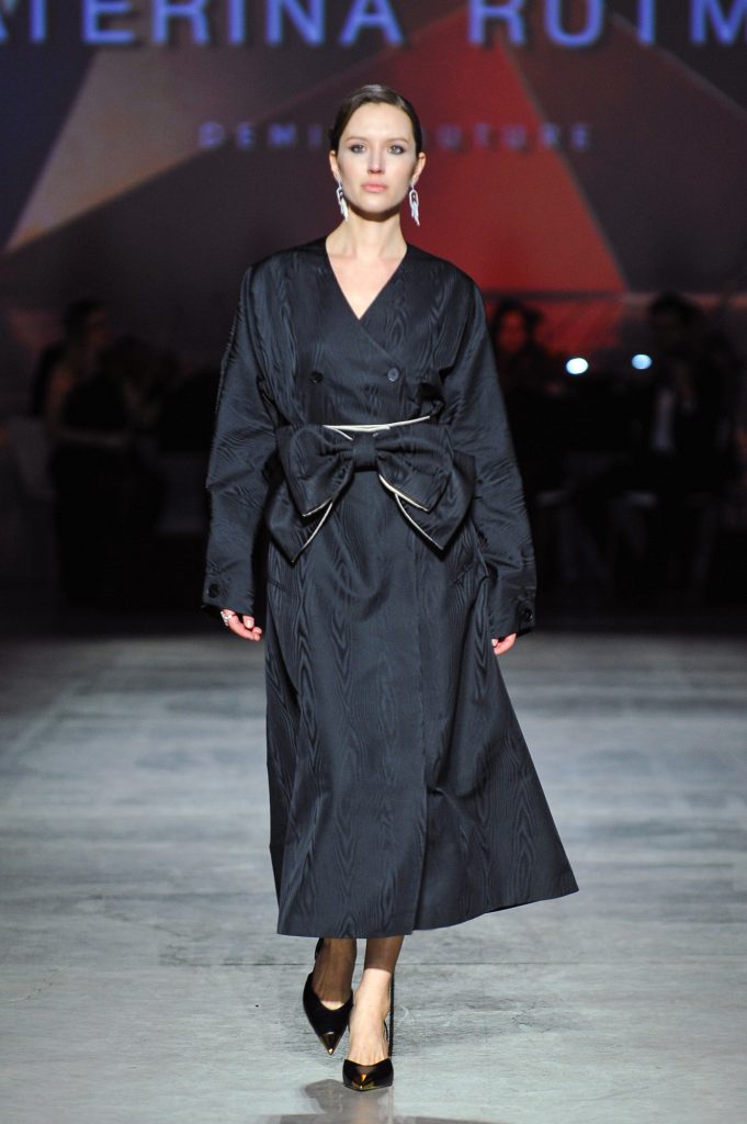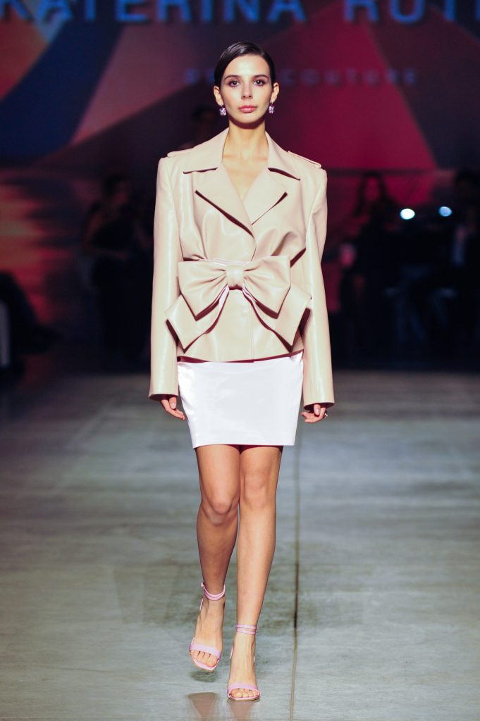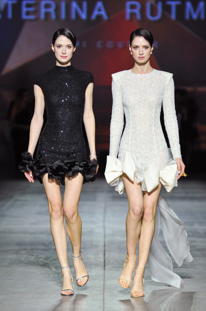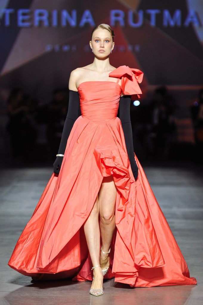 The silhouettes are constructed through geometry, asymmetry, and architectural logic, referencing Ekster’s principles of pure colour, diagonals, and contrasting planes. At the same time, bows and voluminous flowers — recognizable elements of the KATERINA RUTMAN signature — bring movement, emotionality, and a sense of modern femininity to the looks.