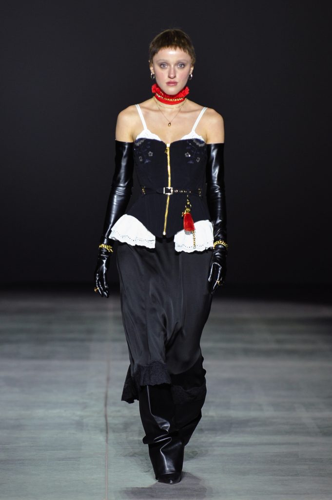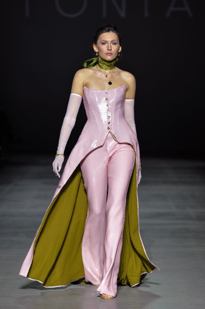 The designer also paid close attention to accessories and jewellery depicted in ceremonial portraits of European monarchs. The runway looks are complemented by gloves, bows, and striking pendants, brooches, bracelets, and necklaces created in collaboration with the jewellery house Золота Країна.