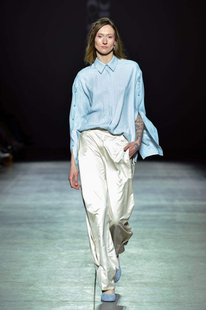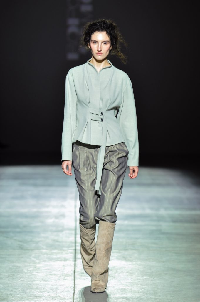 A strong focus on the waist, defined by belts and extended half-belts, brings together femininity and geometry. Bold contrasting details play against the collection’s softness, balancing fragility with presence.