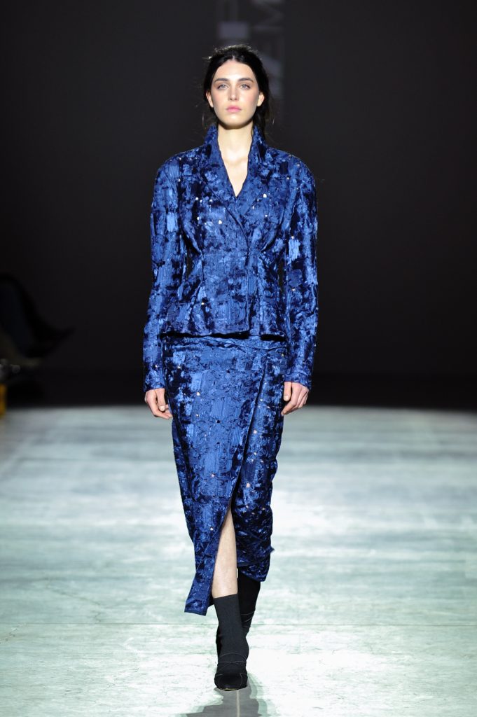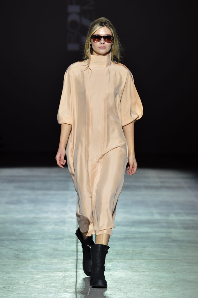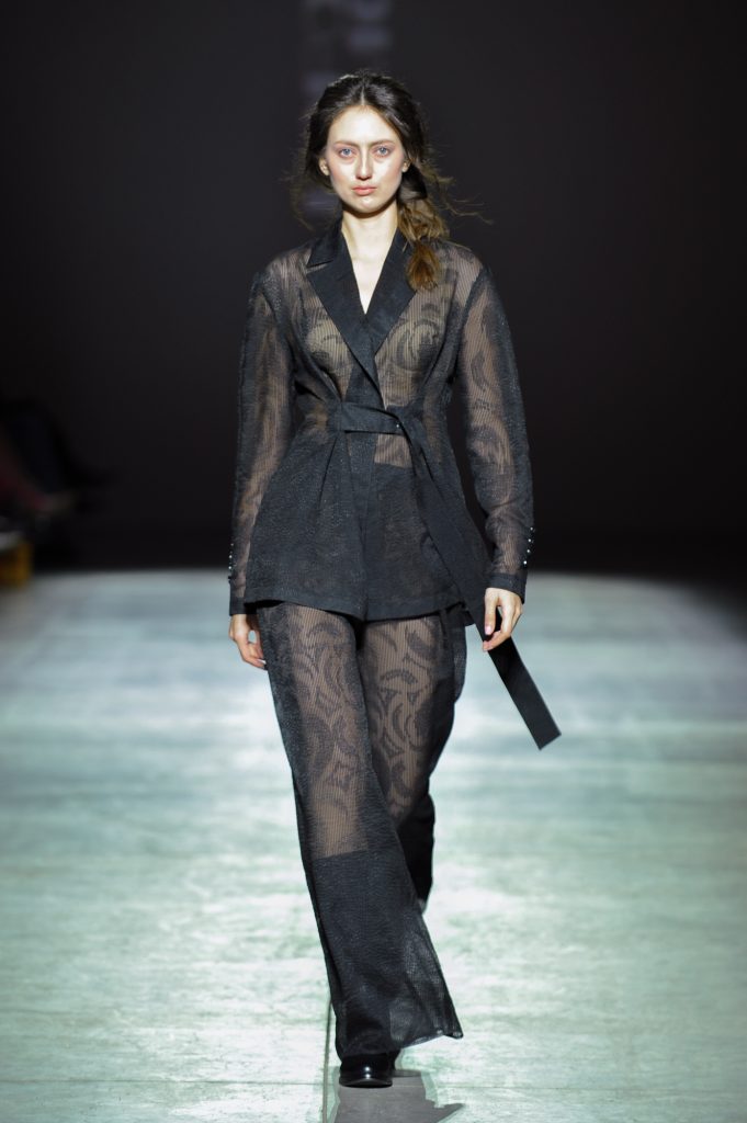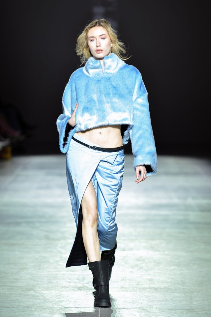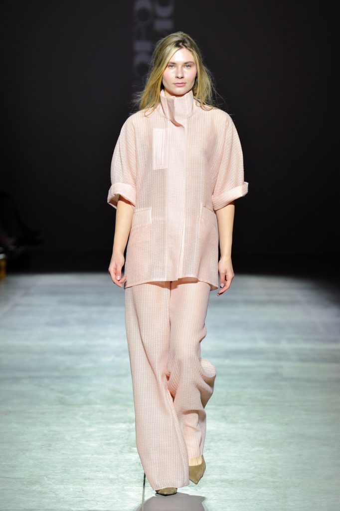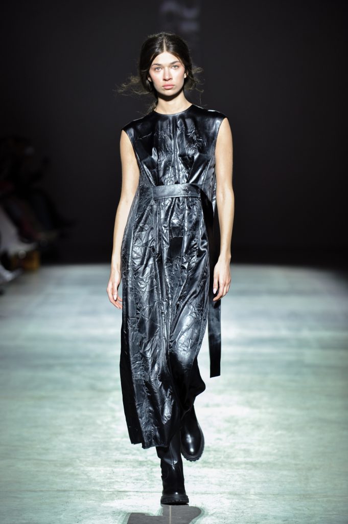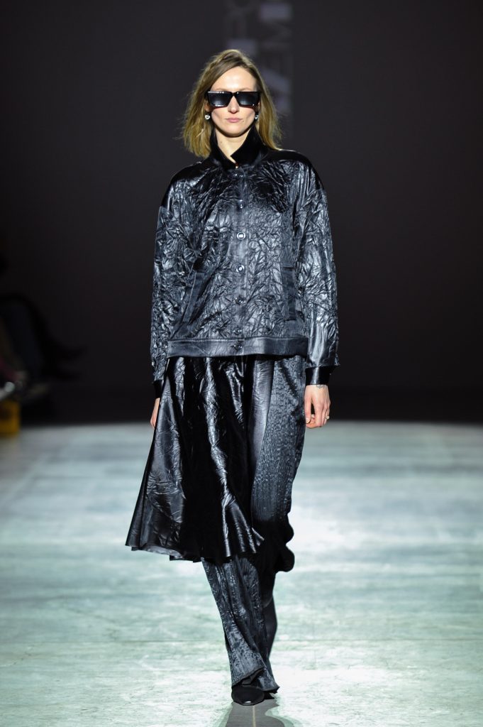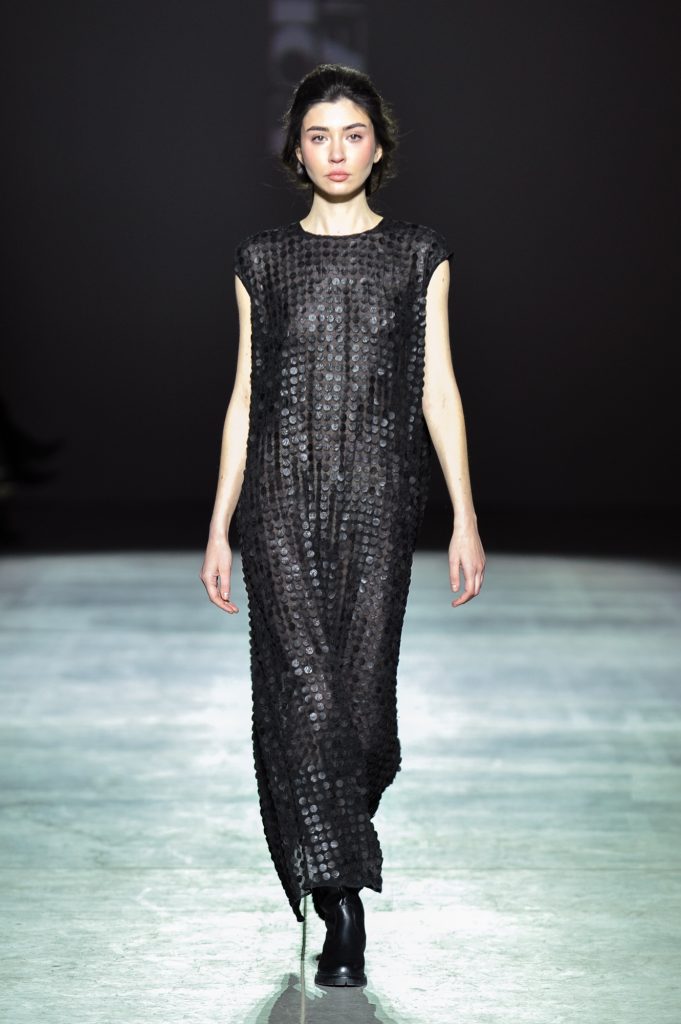 Texture becomes a defining element. Double-faced wool and faux fur contrast with sheer chiffons, silk, and organza. Cotton and viscose introduce practicality. Crinkled finishes, natural leather appliqués, and fabrics constructed from ribbons add dimensionality, echoing the layered complexity of the city itself.